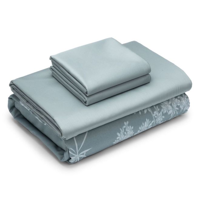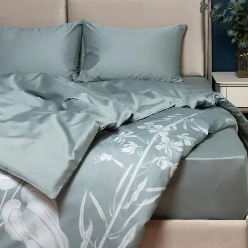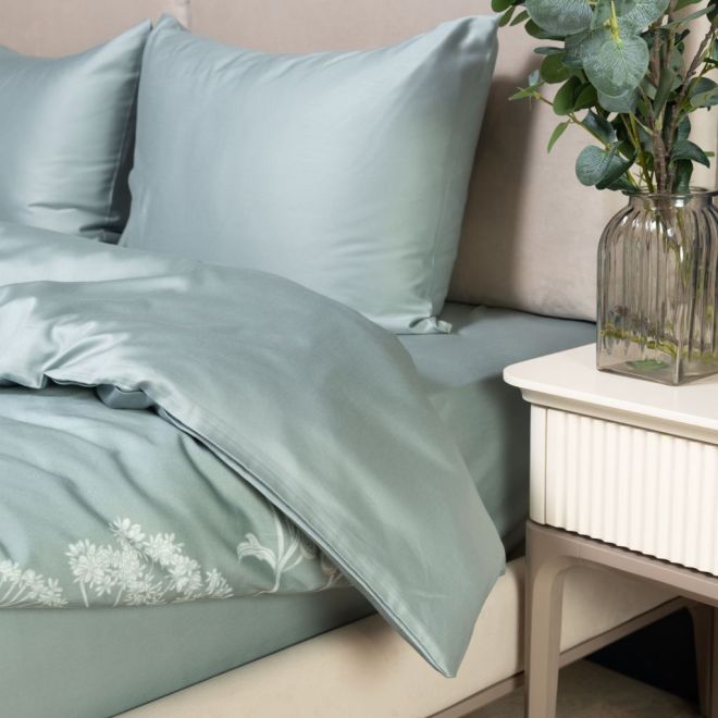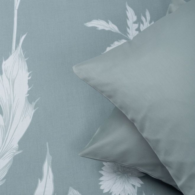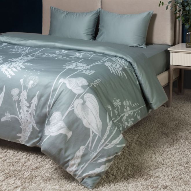Постельное белье «Августина» окрашено в мягкие оттенки природы, характерные для эко-стиля. В качестве основы выступает приглушенный серо-зеленый оттенок, на фоне которого изображены листья, одуванчики, веточки укропа и стилизованные листья кувшинок серебристо-серого цвета. Такой биофильный дизайн дарит ощущение покоя, умиротворения и единения с природой. Принты украшают пододеяльник, а простыня и наволочки выполнены из однотонной ткани-компаньона. Наволочки и пододеяльник имеют удобные прорези.