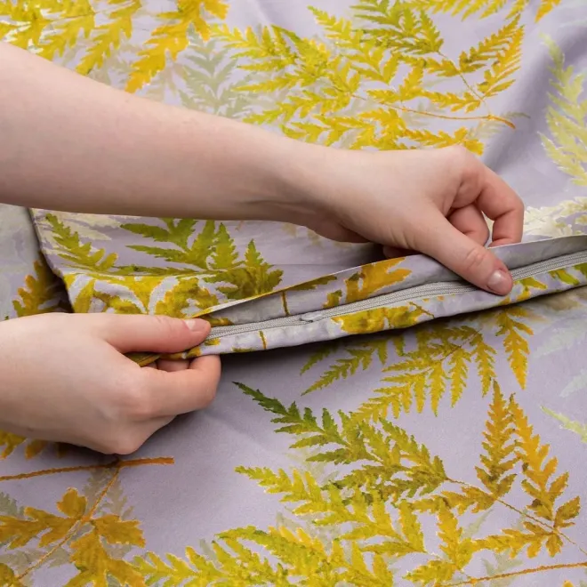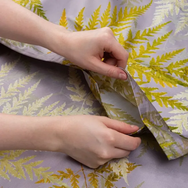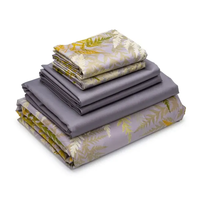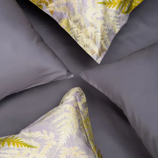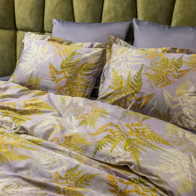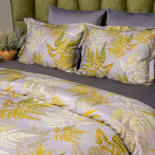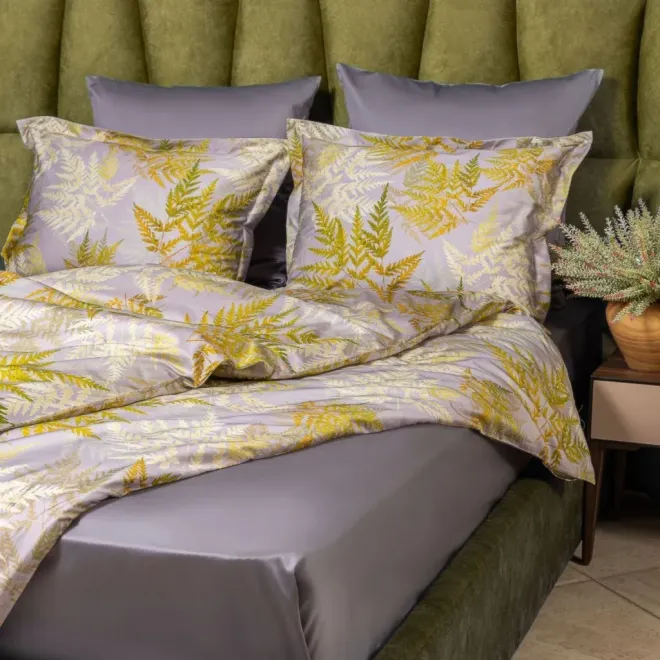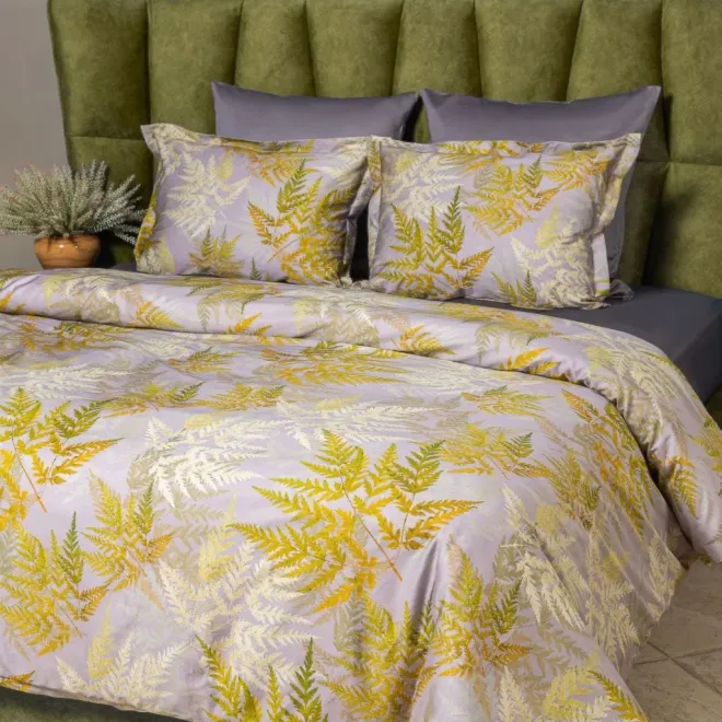 Постельное белье «Эрика» окрашено в насыщенные оттенки, характерные для эклектики – это базовый антрацитовый и акцентные оливковый, горчичный, травяной и цвет карри. Входящие в комплект пододеяльник и одна из наволочек украшены изображениями листьев папоротника. Вторая наволочка и простыня выполнены из однотонной ткани-компаньона антрацитового оттенка. Все наволочки имеют застежки-клапаны, а наволочки в размере 50х70 сантиметров дополнены декоративными бортиками-ушками.