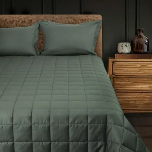 Комплект выполнен в гармоничном сочетании цвета морской волны и молочного оттенка, и входящее в него одеяло декорировано геометрическим узором в виде квадратов. Такое решение прекрасно подойдет для интерьера в современном стиле.