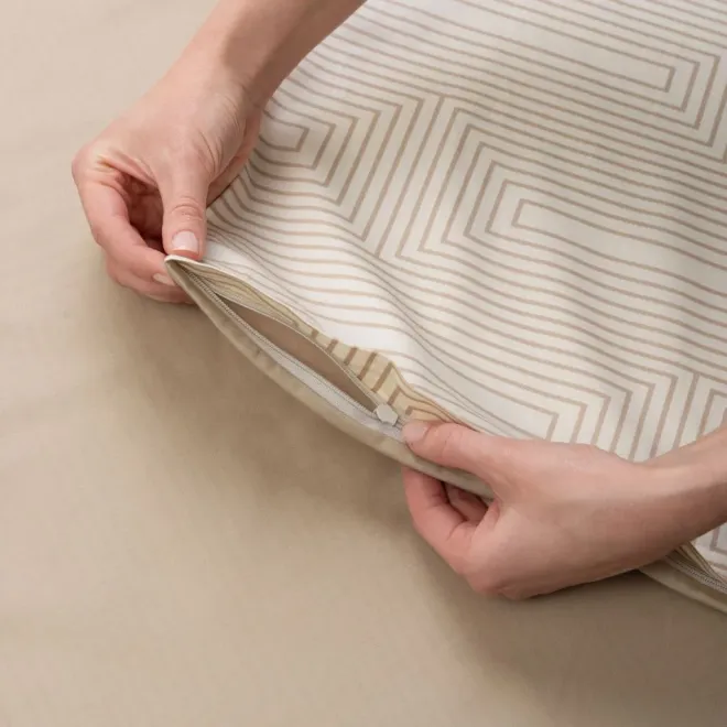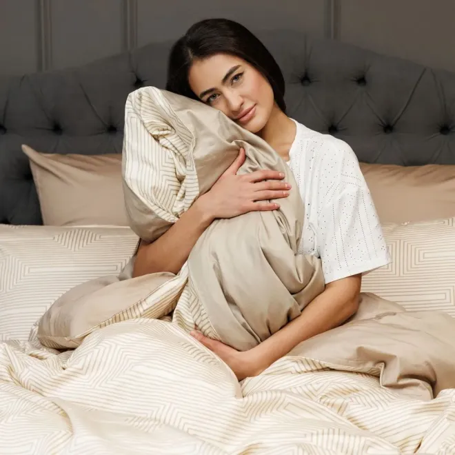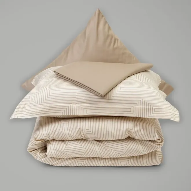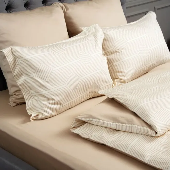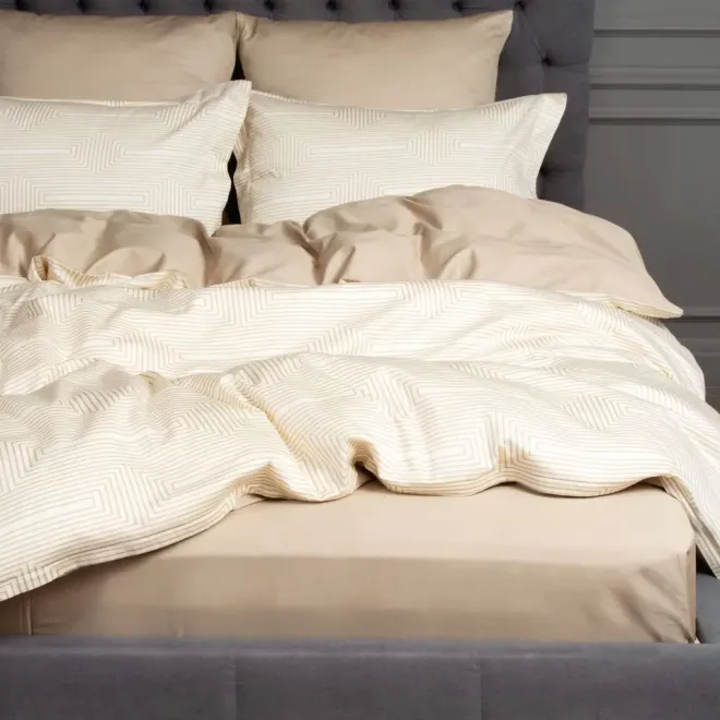 Комплект «Иллюзия» выполнен в сочетании оттенка «ванильный лед» и бежевого. Умиротворяющая цветовая гамма дополнена ненавязчивым геометрическим принтом с иллюзией 3D-эффекта.