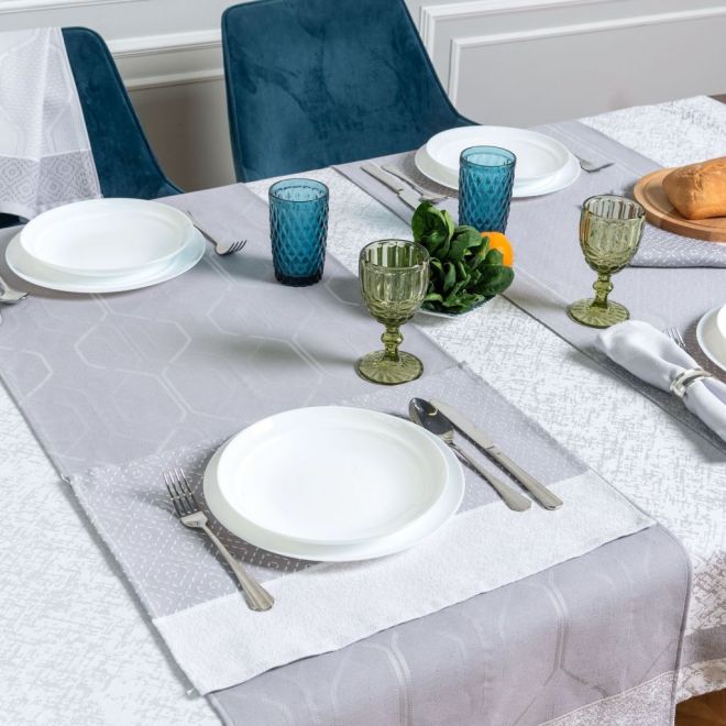 Столовая дорожка стелется на основную скатерть или прямо на стол. Этот предмет коллекции способен моментально украсить застолье: добавит фактурности, цвета и расставит акценты. Дорожку можно расположить одну вдоль стола для основных блюд и закусок или несколько поперек, чтобы расставить на них тарелки и положить приборы для каждого приглашенного. Еще изделие предотвратит механические повреждения столешницы и защитит ее от нежелательных пятен.