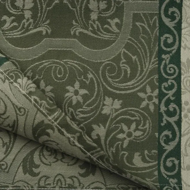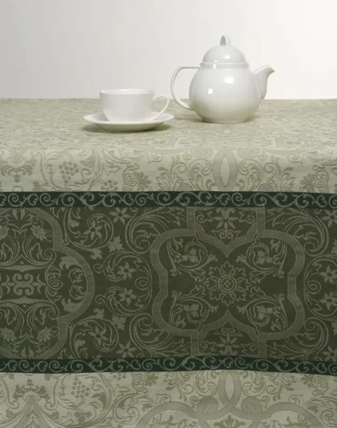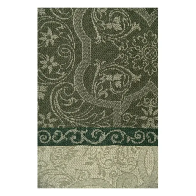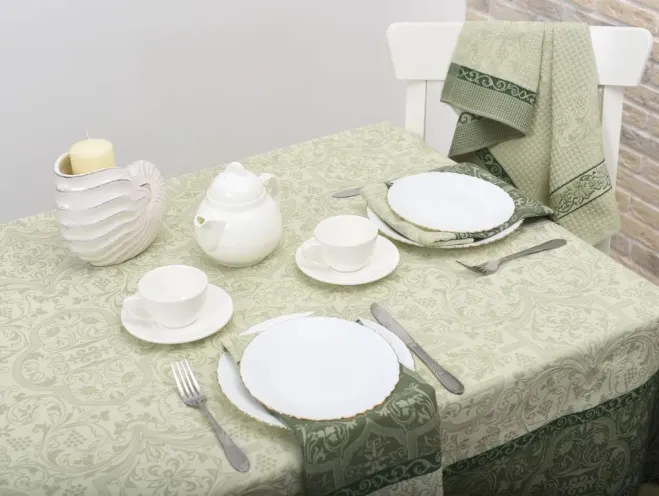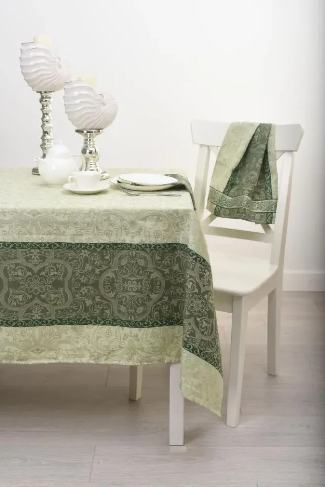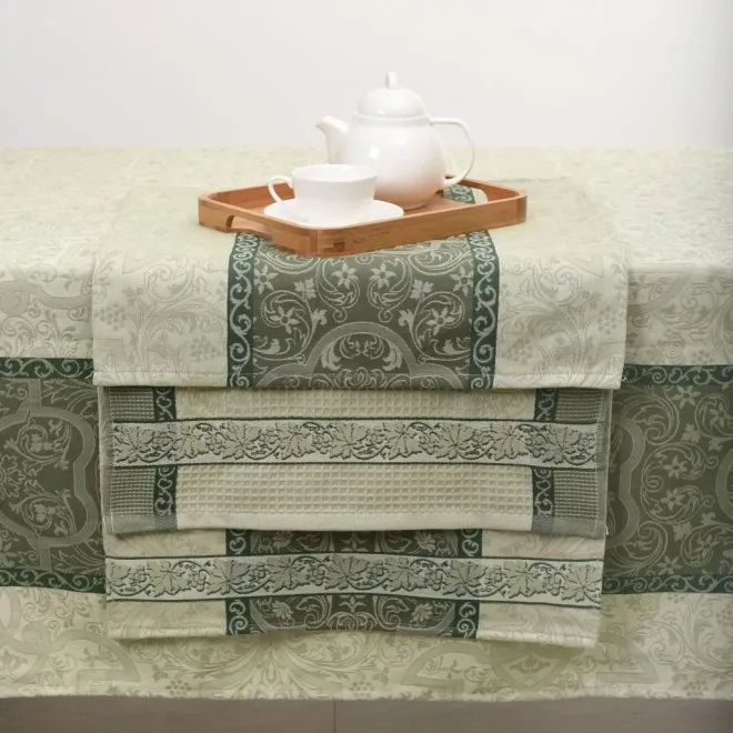 Скатерть из гладкой хлопковой ткани – роскошные сады, увитые виноградной лозой и спелыми гроздьями ягод. Оттенки тростника и кедрово-зеленого цвета изделия призывают отвлечься от забот и насладиться угощениями на щедро накрытом столе. Нежная скатерть размером 200х150 сантиметров с живописным орнаментом украсит стол и преобразит столовую зону. Изделие в комплекте с салфетками станет желанным и практичным подарком для хозяйки.